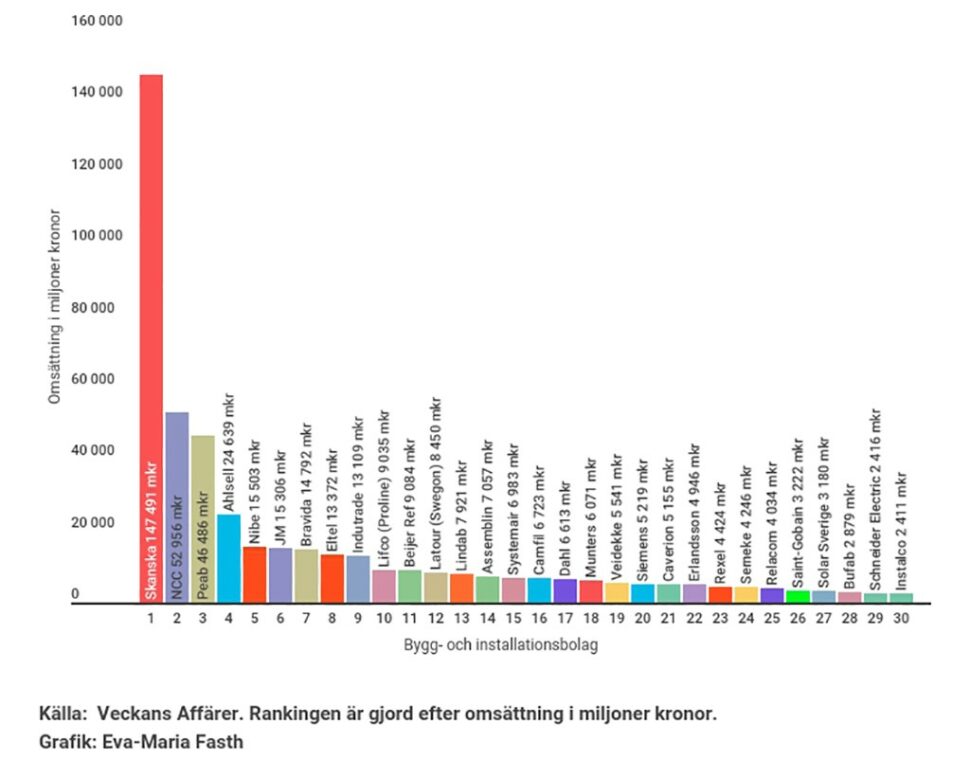 Värmepumptillverkaren Nibe ligger på femte plats (15,5 miljarder kronor, + 16 procent), tätt följd av byggföretaget JM och installationsjätten Bravida. Konkurrenterna Assemblin och Caverion återfinns på 14:e respektive 20:e plats.