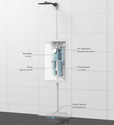 – Det ger två effekter: För det första får varje droppe sin egen yta och huden kommer i kontakt med allt vatten. Därför ger det samma funktionalitet med endast 2 procent av normal vattenanvändning. Det andra är att hastigheten ökar till ungefär 50 km/h, det ger högtryckseffekt som ökar rengöringen.
