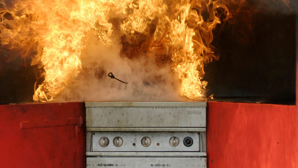Branden startade då någon av hantverkarna lagt en duschslang på spisen i köket och sen satt på spisen.