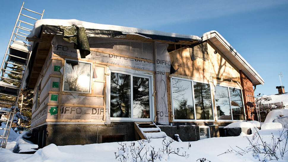 Snövallarna ligger höga längs gatan i villaområdet där det som kallas Sveriges mest moderna ekohus håller på att bli klart. Minusgraderna biter i kinderna utanför huset. Men inne i vardagsrummet landar fötterna skönt på vattenburen golvvärme.