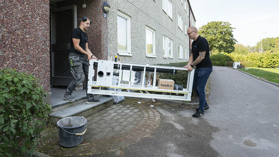 Arbetslaget från installatören Aquadus VVS tar emot kassetterna och kollar att leveransen är komplett. Därefter bär de upp kassetterna till lägenheterna i väntan på installation.