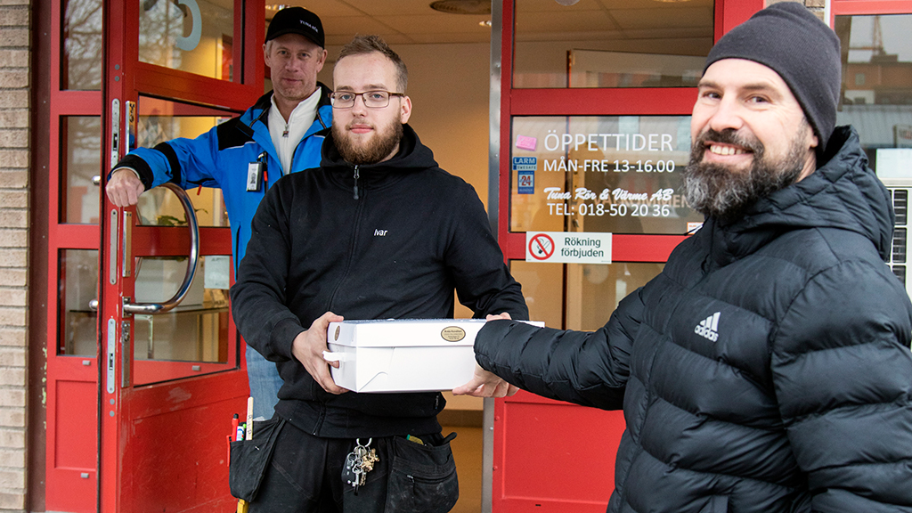 Rörmokargänget på Tuna Rör i Uppsala hörde av sig till VVS-Forum och bad om lite pepp i vintermörkret. Chefredaktören ryckte ut på en coronasäker tårtleverans.