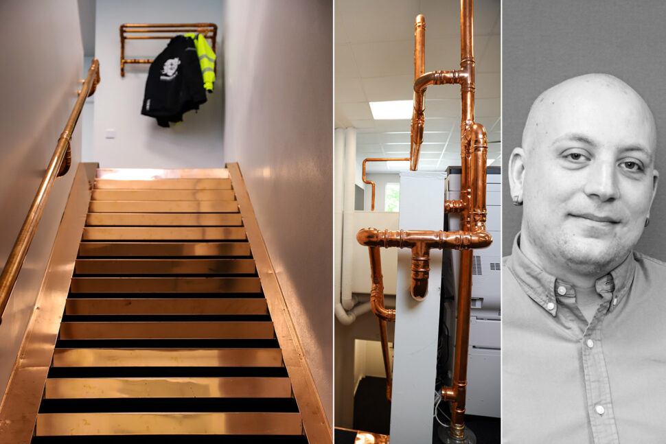 – Den är klädd med kopparplåt och vi har byggt räcket med kopparrör. Det går ihop med ett konstverk vi byggt i kopparrör uppe på kontorsvåningen. Personligen är jag lite less på kopparkonstverk, men i och med att vi är en VVS-firma så känns det passande. Det ser trots allt häftigt ut och ger ett bra första intryck.