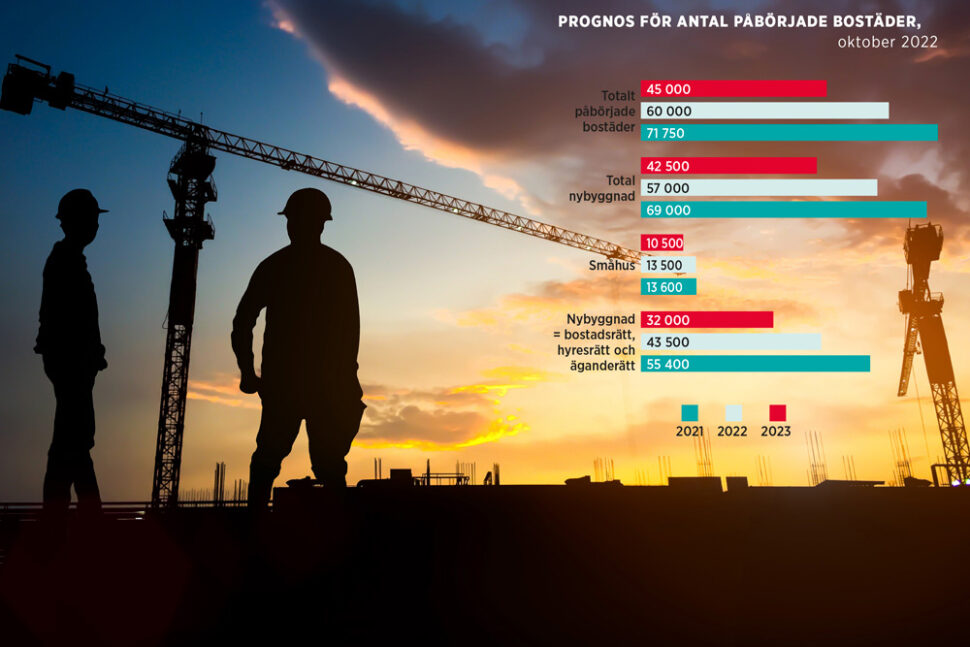 Under 2023 är bedömningen att cirka 45 000 bostäder påbörjas, en minskning med 25 procent jämfört med 2022.