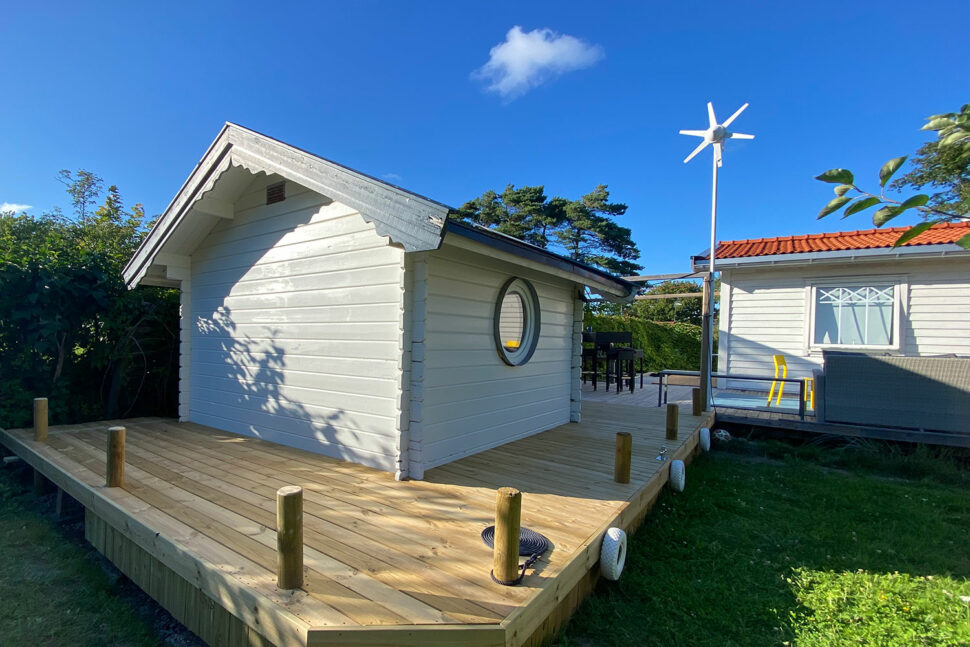 – Jag tänkte att om man kan använda den till livet ombord på havet så kanske den kan bidra till energin i mitt hus. Kraftverket på altanen levererar el till tre lastbilsbatterier jag fick gratis, de hade tagits ur en båt i Smögen. Huset står på en blåsig plats på en ö i Bohuslän så batterierna som står i min källare är ofta fulladdade. De innehåller mycket kräm och är bra framför allt om det blir strömavbrott vilket det ofta blir på en så här avlägsen plats. Då kan jag tända massa LED-lampor i mitt hus medan grannarna sitter i mörkret.