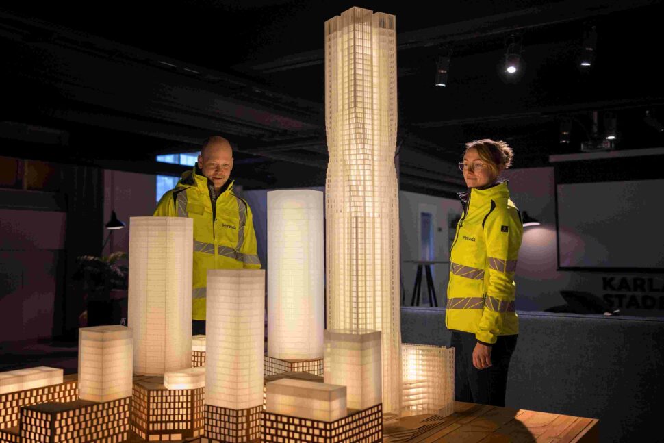 Produktionschefen Erik Sjöberg och projektchefen Johanna Hammarfjord vid en modell av den nya stadsdelen Karlastaden där Karlatornet är startskottet. Foto: Niklas Maupoix