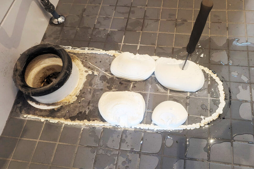 ”Jag hade demonterat en gammal wc och den människa som monterat den hade nog inte förstått hur man limmar en wc” berättar Mats G Andersson som hade nöjet att ta loss denna wc-stol och så här skumt var det under den, visar han i Facebookgruppen Rörmokare med gränser.