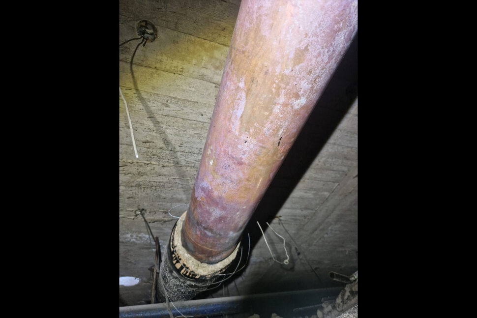 Gjutjärn? Nä, när det inte finns några inspektionsluckor behövs starkare grejer, tänkte kanske den som satte dit denna 6 tums kopparpinne.