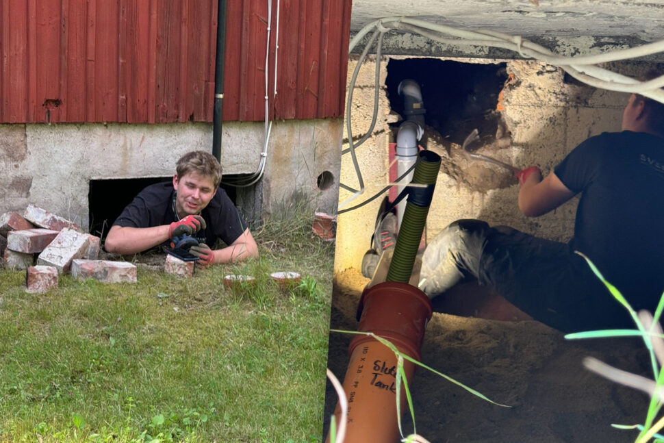 Ibland har VVS-montörerna tur och det är lite rymligare under ett hus, men i det här fallet var det trångt. Entrén var bara en liten jordkällare och sedan behövde Lucas Roeger ta sig ännu längre in under huset, där var det bara en lucka som han först fick knacka upp och ta sig in under. Det dammade ordentligt och skyddsmask var nödvändigt.