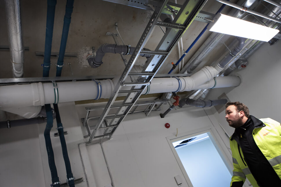 – Allt avlopp är draget i ljuddämpande rör, även avloppsrören från kök och barer. Du kan sätta ett ljuddämpat rör och sen övergå till ett mindre ljuddämpat rör.
