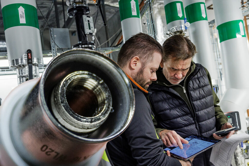 Deras uppgift i dag är att vandra runt i kåken till de 13 stammarna och mäta av temperatur, flöde och tryckfall via just STAD-ventilerna i VVC-systemet.