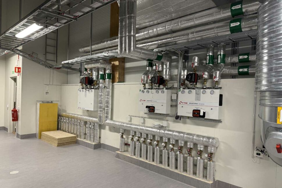 – Nej, funktionen är densamma som i en traditionell installation. Vi installerade flera fördelarskåp i respektive hall, och drog matningarna till dessa via betongplattan upp till undercentralen/fläktrummet. I undercentralen byggde vi en storskalig fördelare med styrventiler, vilket gör det möjligt att styra skåpvis istället för slingvis som i normala fall. Det gav en mycket driftsäker och enkel anläggning, både när det gäller injustering och framtida drift.