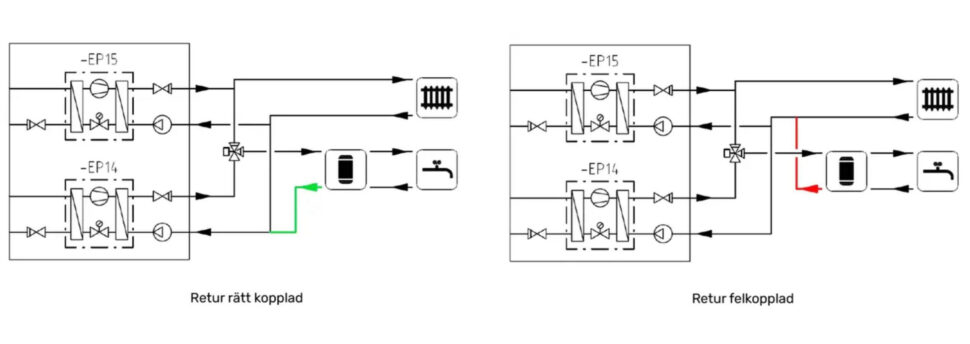 Det kan vara enklare att ansluta fel när det är trångt, alltså på den gemensamma returen från värmesystemet.