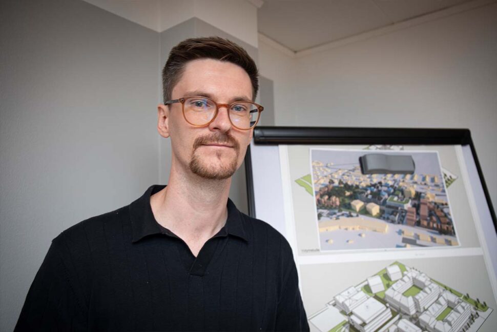 – Nu söker vi bygglov för den första av fem kommande huskroppar som ska bilda framtidens Lödde Centrum, med lika mycket lokalyta som vi har i dag och med bostäder ovanpå, säger förvaltaren Anton Forsell.