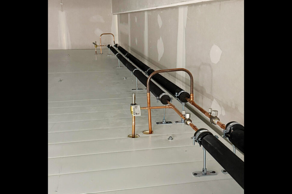 – Det vi ser på bilden är dock inte helt komplett utan något jag tog i stundens hetta. Det är uppe på ett mejerirum och undertill hänger förångare. Vätskerör med en magnetventil som går ner i förångaren och ut via sug-gasledningen, berättar Tony Cavander för VVS-Forum och nämner att vid fototillfället saknades trycktransmitter som har nu blivit inlödd.