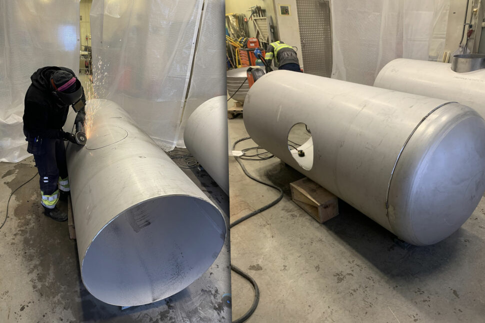 – Vi bygger tre stycken tankar i DN 1000-storlek och de ska fraktas vidare till Frankrike, men jag kan inte gå in på detaljer kring kunden. Det är trycktankar och det kommer att vara någon sorts vätska i dem. Vi har fått ritningarna och prefat tankarna här på firman.
