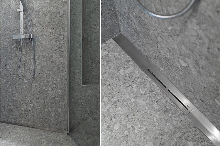 I badrummet har familjen valt den väggnära golvrännan TECEdrainprofile – en stilren lösning som kan anpassas till duschens bredd.
