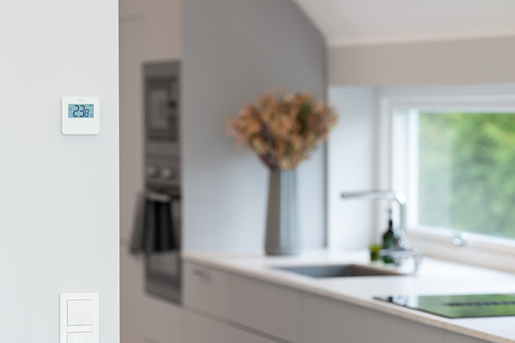 Elektronisk rumstermostat från TECEfloor styr golvvärmen och håller en jämn och behaglig temperatur i rummet.