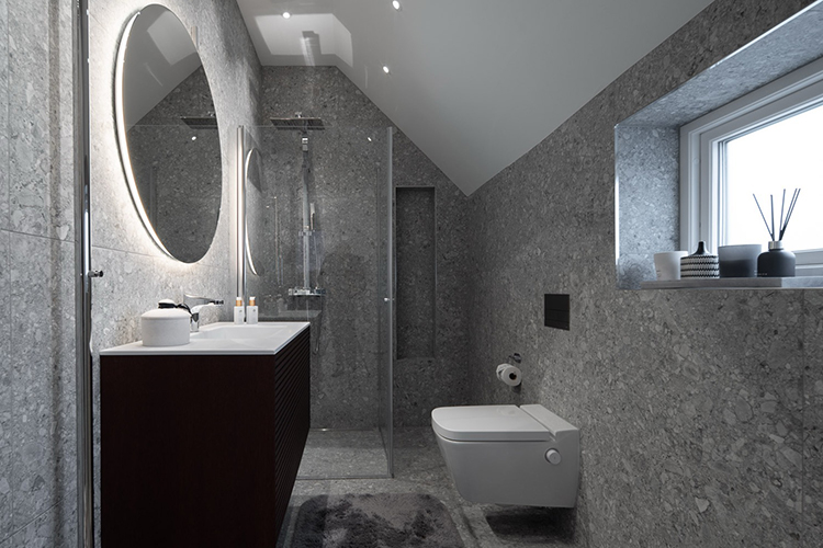 I badrummet finns en vägghängd WC-fixtur med Safetybag, kombinerad med spolknappen TECEsquare i borstat rostfritt stål och duschtoaletten TECEone – en kombination som ger rummet ett modernt och enhetligt uttryck.
