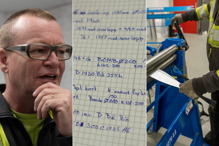 Isoleringsmontören Greger Meeks räknar och räknar och räknar innan han skrider till verket. Så här sickar han en plåt till en rörböj i fem steg.