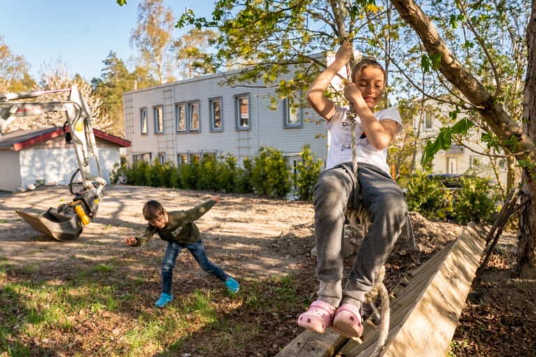 Efter en skräckfylld bilresa från krigets Ukraina kom Viktoria Durban och hennes barn Vara, 10 år och Dima, 6 år, till villan i Enskede utanför Stockholm. Här har rörmokaren Roger Harju och hans fru Natalja ordnat plats för familjen.