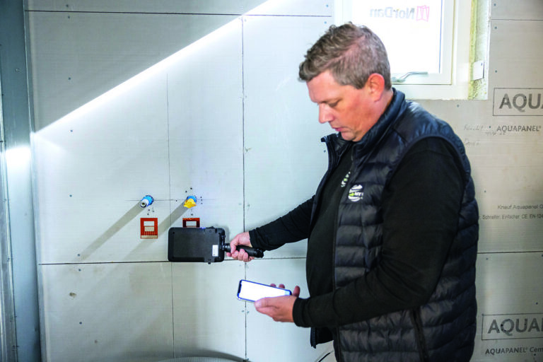 (LÅST ARTIKEL | FÖR PRENUMERANTER)) Fuktsäkert, underhållsfritt och lättjobbat för installatörerna. Det är målet med bygget som pågår utanför Eskilstuna. Joacim Bergström på My Future Living vågar avge ett anmärkningsvärt löfte: I det här huset kommer det aldrig att uppstå några vattenskador.