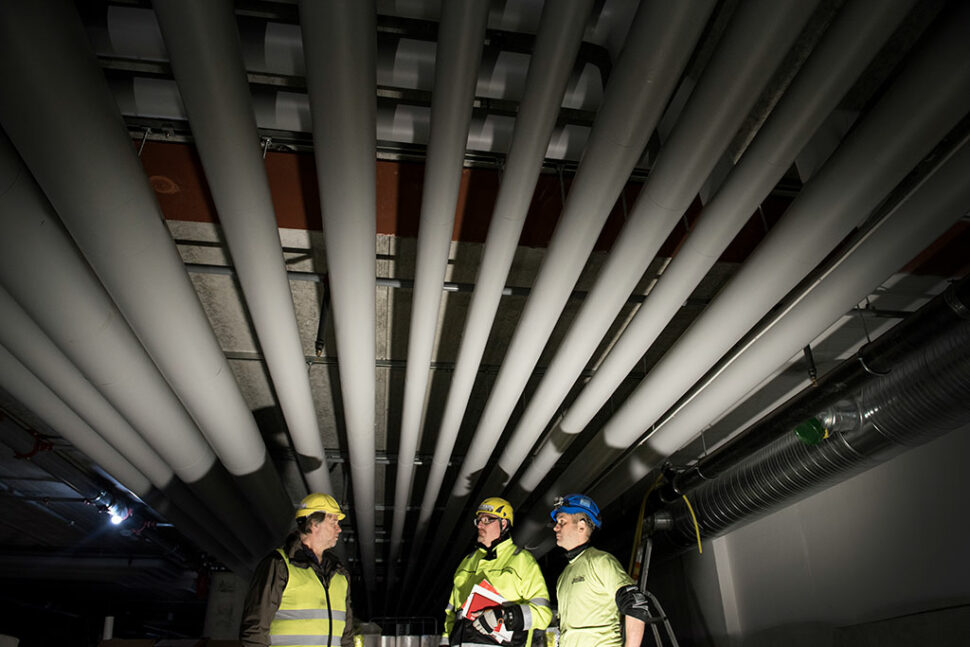 Vi kryssar mellan kranbilar och hjullastare på byggarbetsplatsen och går ner till källaren och in i undercentralen, husets hjärta.